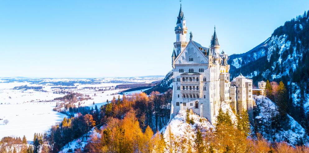Kasteel Neuschwanstein maakt al van verre indruk met zijn onmiskenbare silhouet. Het was ook het kasteel dat Walt Disney inspireerde voor zijn tekenfilmkastelen en dat model stond voor het beroemde Disney-logo. De torens en kantelen van het kasteel steken dramatisch af tegen de hemel, omringd door dichte bossen en het indrukwekkende Alpenpanorama.